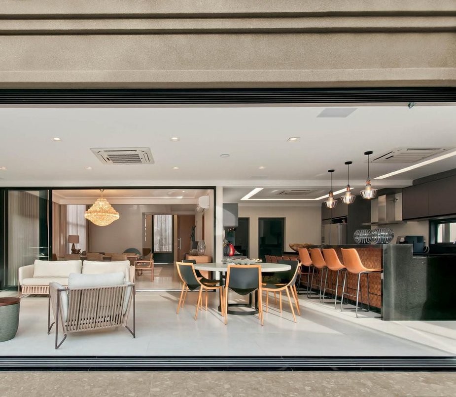 Nossos projetos buscam conectar espaços, unir pessoas e promover uma harmonia perfeita entre cada cômodo. Afinal, a magia de um lar, e os ambientes fluem suavemente um para o outro, criando uma sensação de amplitude e bem-estar. Fotos: Revista Interarq.