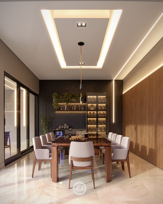Aquele charme que toda sala de jantar possui foi evidenciado ainda mais pelo projeto, saindo dos tons pastel e com um toque escuro, a parede ao fundo recebeu o revestimento Mos ripa Nero Venato, que trouxe charme e elegância em conjunto com a cristaleira e o buffet, a madeira trouxe aconchego ao ambiente e a iluminação valorizou ainda mais o ambiente, finalizando no piso o revestimento Bianco Covelano.