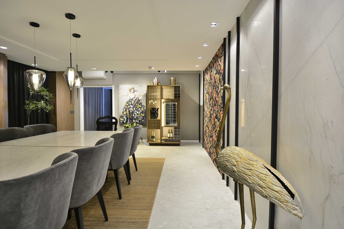 Com inspiração na elegância e ousadia da marca Dolce & Gabbana criei um ambiente muito especial para a 2a edição da Mostra EliteDesign. São tantos elementos especiais que me inspiraram desde o início, mas tem alguns que precisam ser destacados. Começo pelos produtos que desenhei especialmente para o espaço como a cadeira PETALO (veludo cinza e pés pretos), a DOLCE CHAIR (laca preta com jacquard amarelo) que está postada nas cabeceiras exibindo seu encosto de espartilho com renda, a adega LEGNO com suas portas rebatíveis, ou também, a mesa GABBANA que recebeu um tampo de quartzito Bianco Superiore. O piso em porcelanato de padronagem tipicamente italiano, as fotografias selecionadas e produzidas especialmente para o projeto, o tapete de juta com seda rústica, o tecido floral das paredes e da saia da personagem que habita a tela pintada sob encomenda, as luminárias que formam um conjunto de agulhas de costura sobre a mesa, a avestruz em latão garimpado num antiquário... todos estes elementos, juntos, formam um ambiente inovador e surpreendente, cheio de alma e de personalidade.