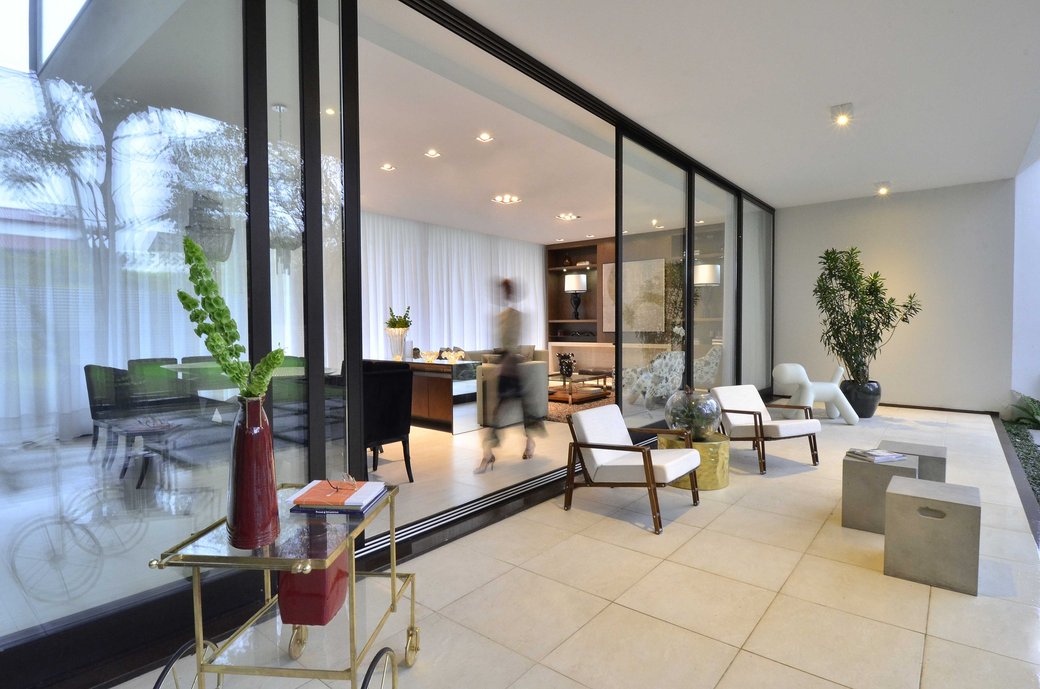 Elegância despretensiosa, praticidade sem simplismo e uma estética atemporal voltada para o conforto e bem-estar dos clientes foram as premissas para o desenvolvimento deste projeto assinado pelo arquiteto Marcelo Minuscoli. A plástica dos materiais de acabamento especificados na Portobello Shop Moinhos tendeu para um estilo contemporâneo e conferiu à toda residência uma atmosfera delicada e de bom gosto. O porcelanato 90x90cm do andar térreo foi inspirado na textura do mármore travertino, ficando muito adequado para as grandes áreas desta casa. Outros itens como os revestimentos cerâmicos que imitam madeira da cozinha gourmet e os ladrilhos em tons de turquesa da cozinha, quebram a monotonia e conferem personalização a cada espaço. O layout do diferenciado projeto arquitetônico propõe uma área social deslocada do corpo principal da construção, configuração que fez com que o living e o jantar tivessem um pé direito generoso, e fossem diretamente interligados às duas varandas: a frontal, com piscina, e a dos fundos, onde se encontra o pátio interno voltado ao convívio diário. O design primoroso e a ótima qualidade dos móveis soltos da Casiere Interiores encantaram à primeira vista os clientes e os profissionais que buscavam aliar novas cores, texturas e estampas aos ambientes. A numerosa família composta pelo casal, duas filhas e avós planejou para cada um sua própria suíte com dormitório, closet e banheiro. A marcenaria da suíte master do casal foi executada pela Formallar Móveis, empresa que também confeccionou o mobiliário exclusivo das Salas e do Gabinete. As demais suítes foram detalhadas na SCA Canoas, loja aonde os arquitetos ainda especificaram os móveis planejados das duas Cozinhas. As bancadas de Silestone, bem como a linda lareira em travertino romano, foram executadas pela Basalto Santo Antônio. O projeto luminotécnico desenvolvido junto à Sulina Iluminação é eficiente e totalmente controlado pela automação. Destaque para os lustres em malha metálica estilo candelabro do jantar, pendentes que traduzem com exatidão o conceito do projeto: Inovador na matéria-prima, clássico na essência. Fotos: Eduardo Liotti