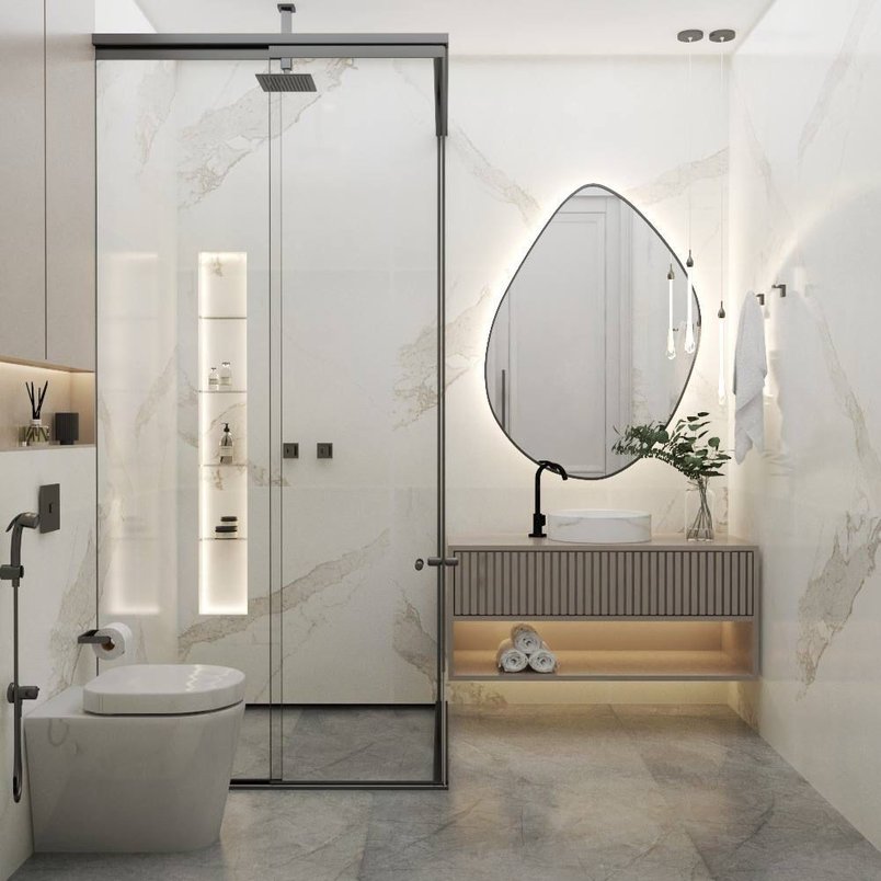 O revestimento, o espelho com formato orgânico e a iluminação suave criam um ambiente acolhedor e contemporâneo. Os detalhes em cores escuras adicionam um contraste elegante, tornando este espaço único e inspirador.