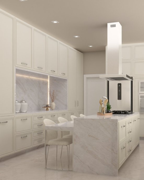 Mesmo em uma cozinha de dimensões reduzidas, é possível criar um ambiente elegante e funcional. Neste projeto, a escolha de tons neutros cria a sensação de amplitude e luminosidade, enquanto soluções de design inteligentes maximizam o uso do espaço disponível.