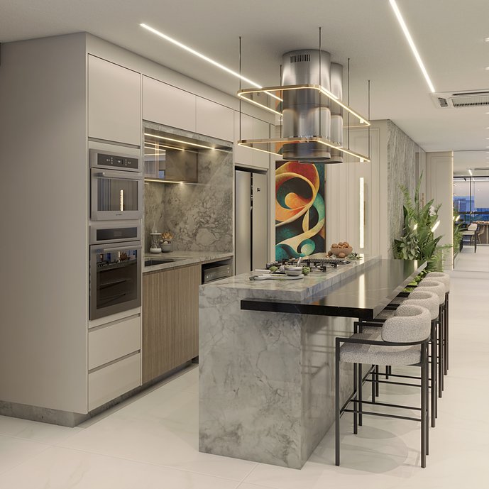 Este ambiente integrado une a cozinha, sala de jantar e sala de estar de maneira harmoniosa e funcional. O uso de materiais nobres, combinado com a iluminação moderna, cria um espaço sofisticado e acolhedor. A ilha central, além de prática para o preparo de refeições, também serve como um local perfeito para socialização. O destaque vai para a obra de arte vibrante, que adiciona um toque de cor e personalidade ao ambiente.
