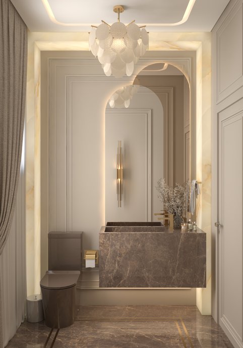 Esse lavabo é um verdadeiro exemplo de elegância e requinte. Com uma bancada flutuante que se destaca pela sua imponência e um espelho arcado que complementa perfeitamente o ambiente, cada elemento foi pensado para criar um espaço acolhedor e luxuoso.
