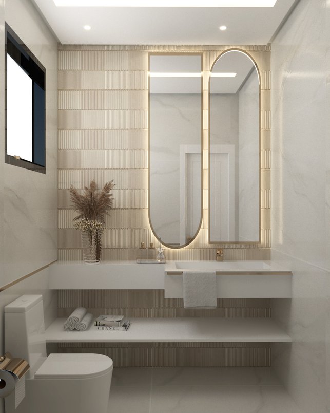 A combinação de revestimentos texturizados com revestimento claro cria um ambiente sofisticado e acolhedor. Os detalhes em dourado e a iluminação embutida no espelho adicionam um toque de luxo, transformando o espaço em um verdadeiro refúgio de estilo.