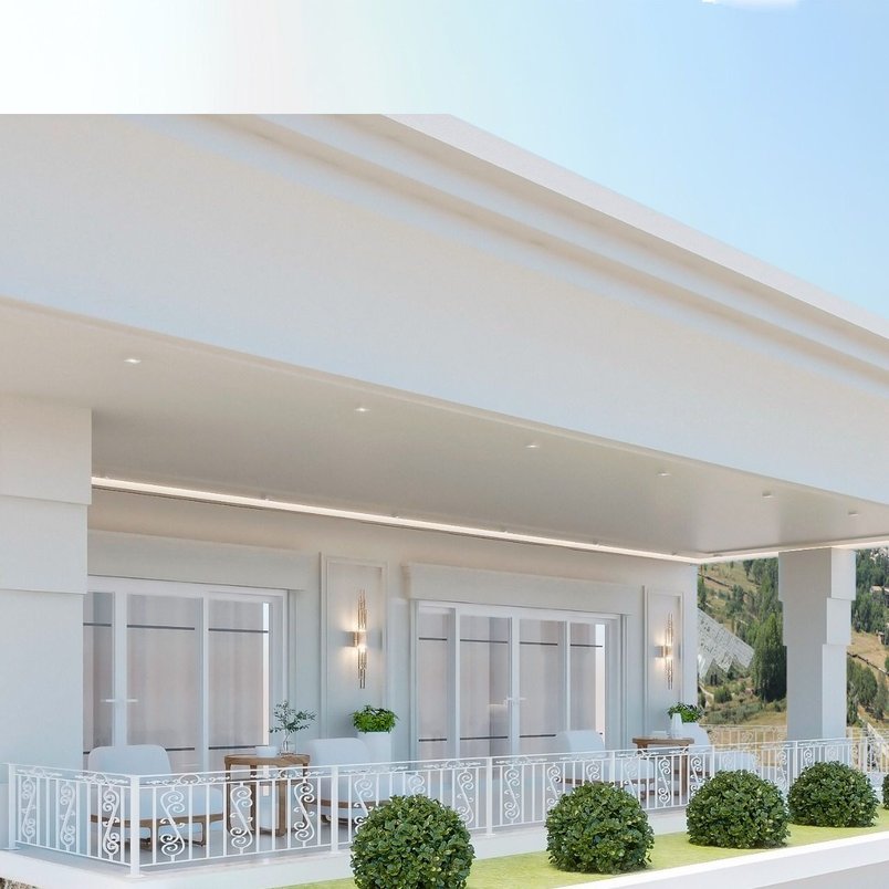 A varanda apresenta um design moderno e clean, com uma paleta de cores predominantemente branca, que proporciona um visual elegante e atemporal. As linhas retas e o uso de materiais simples reforçam a estética minimalista, garantindo um espaço sofisticado e acolhedor.