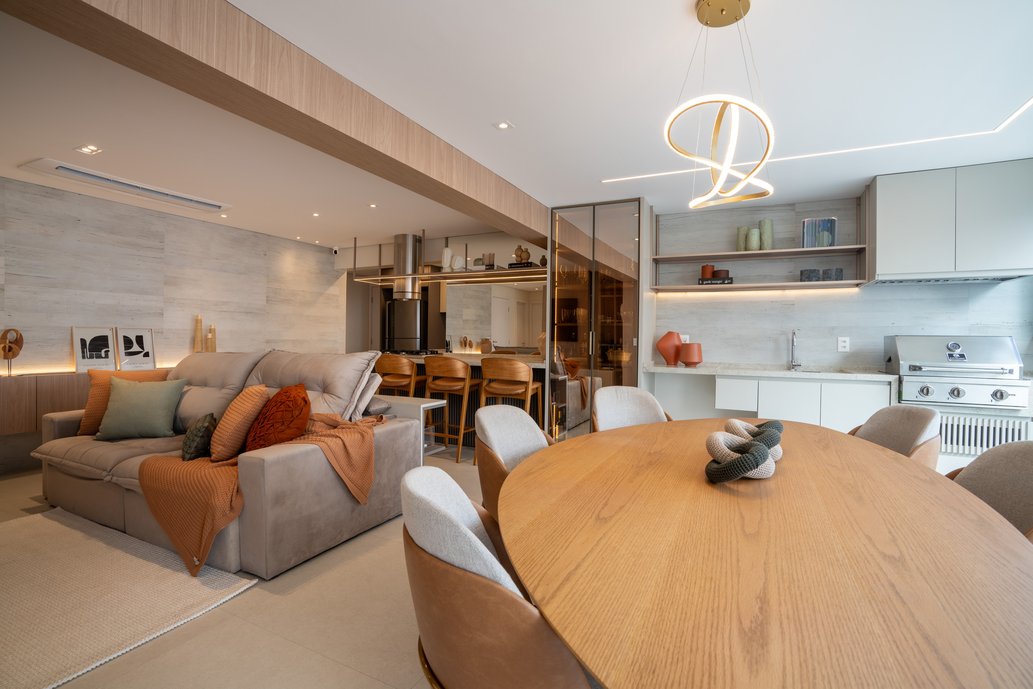 Área social integrada com tons leves e sofisticação, os revestimentos da Portobello ganham destaque, transformando espaços com sua beleza atemporal.