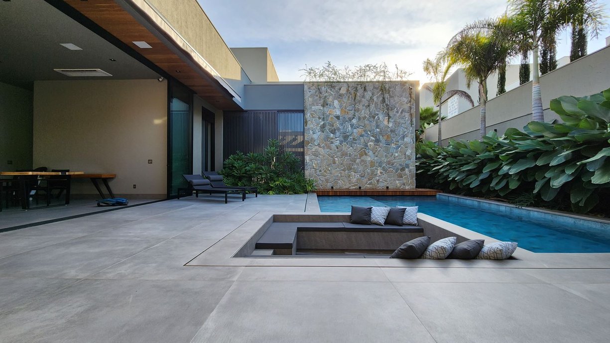 Além disso, o revestimento de pedra e elementos naturais em pontos estratégicos e o paisagismo combinado ao estilo e à estrutura, também desempenharam um papel importante na composição. Foi utilizado o mesmo piso em toda a extensão da casa, garantido a integração dos ambientes e a sensação de amplitude nos espaços.