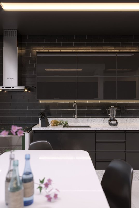 Esse é um dos projetos que estamos trabalhando atualmente e a imagem é uma das propostas de cores que apresentaremos para o cliente. O espaço é multifuncional, concentra cozinha, lavanderia e faz as vezes de ambiente de convivência familiar. Por isso, a iluminação será amarelada e com elevado IRC. A luz amarela é a ideal para o ambiente, deixará o espaço mais aconchegante e um Índice de Reprodução de Cores elevado garantirá a fiel reprodução das cores dos alimentos. Atualmente, todos os elementos emissores de luz (lâmpadas, fitas, etc) são fabricados com tecnologia LED, e um dos baratos dessa tecnologia é que independente da cor de luz emitida, nenhuma delas emite calor, então já descarta a ideia de que a luz amarela deixará o ambiente quente, beleza? Somos apaixonados por esse revestimento que está na parede, é o Liverpool da Portobello, uma releitura contemporânea dos azulejos do século 19, usados originalmente em uma das primeiras estações do metrô de Londres, Liverpool.
