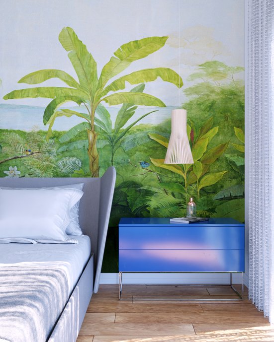 A natureza trouxe a inspiração para a paleta de cores, mais especificamente um dia de praia com clima tropical.????????? O piso em tons terrosos da @portobello faz referência à areia; o móvel ao lado da cama, na cor do ano de 2020 (Pantone Classic Blue) remete ao céu e ao mar; o papel de parede remete à tropicalidade climática, a cortina em tecido telado, teve inspiração nas redes de descanso e deixa a luminosidade entrar de maneira abundante e revelar cada pequeno e precioso detalhe do ambiente.